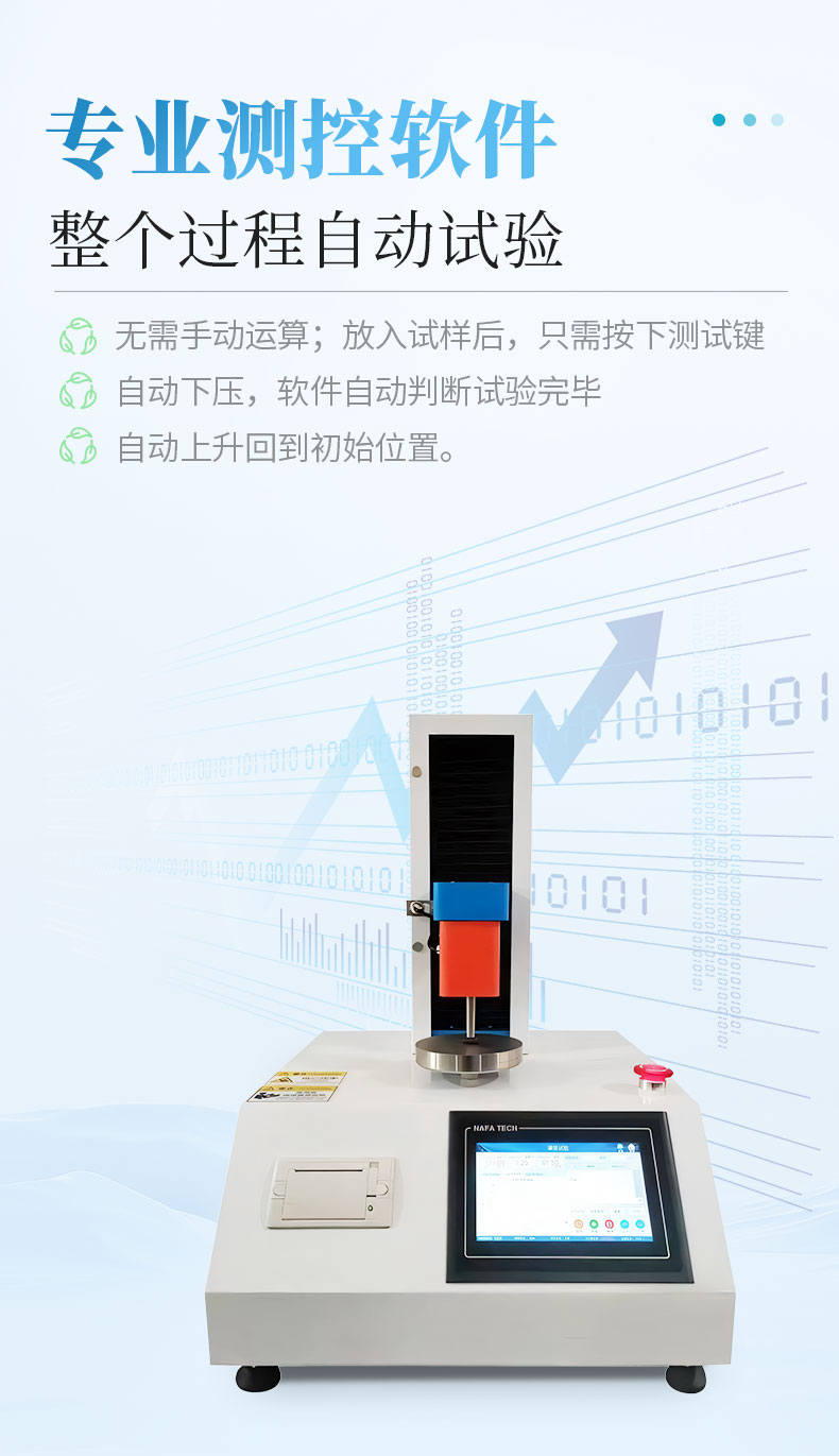 7、軟件:專業(yè)測控軟件,整個過程自動試驗(yàn),無需手動運(yùn)算;放入試樣后,只需按下測試鍵,自動下壓,軟件自動判斷試驗(yàn)完畢,自動上升回到初始位置。
