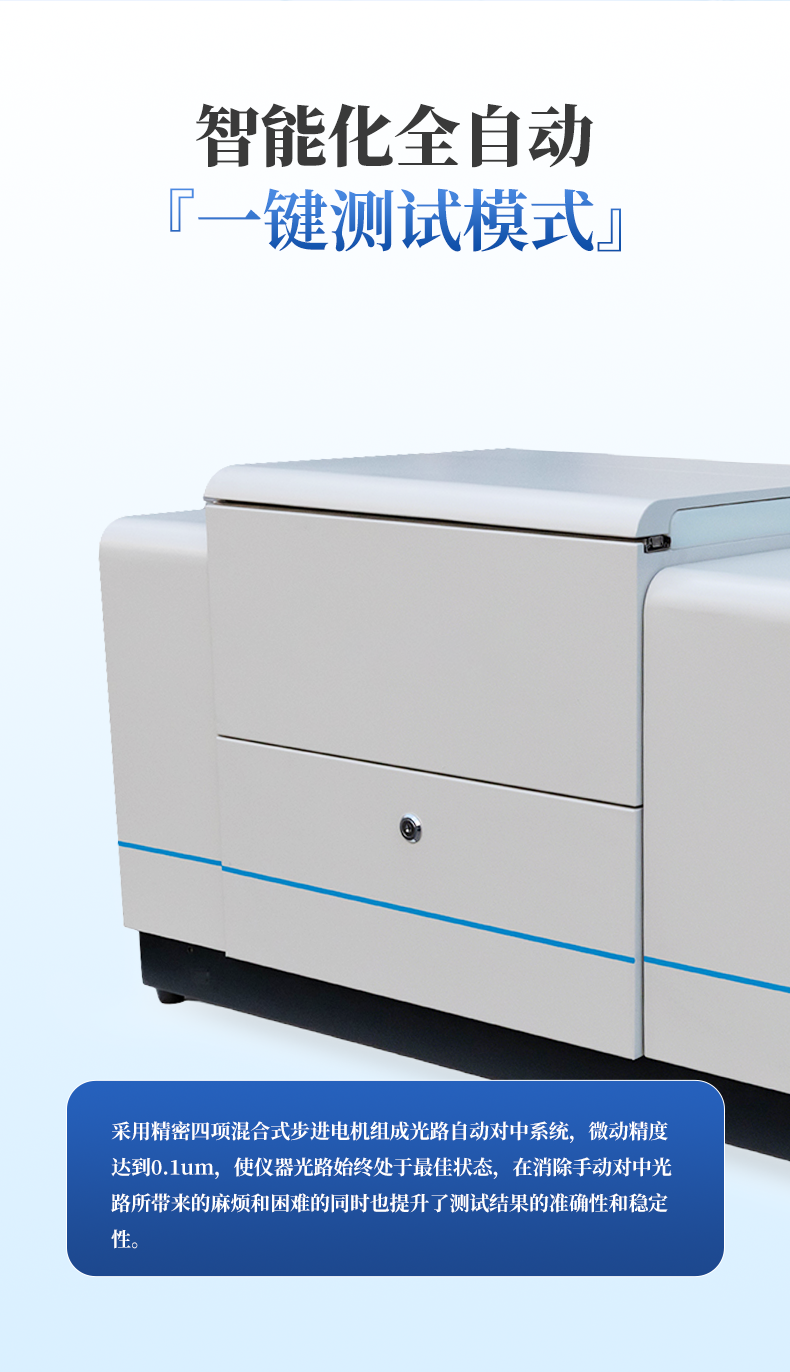 | 光路設(shè)計 | 采用會聚光傅立葉變換技術(shù),使散射光不受透鏡孔徑限制;采用雙譜面光路設(shè)計,有效擴大測量范圍至1200微米;雙激光正交光路使用半導(dǎo)體輔助激光器測量側(cè)向散射0.0155度至164度,將測量范圍進一步擴展。 |