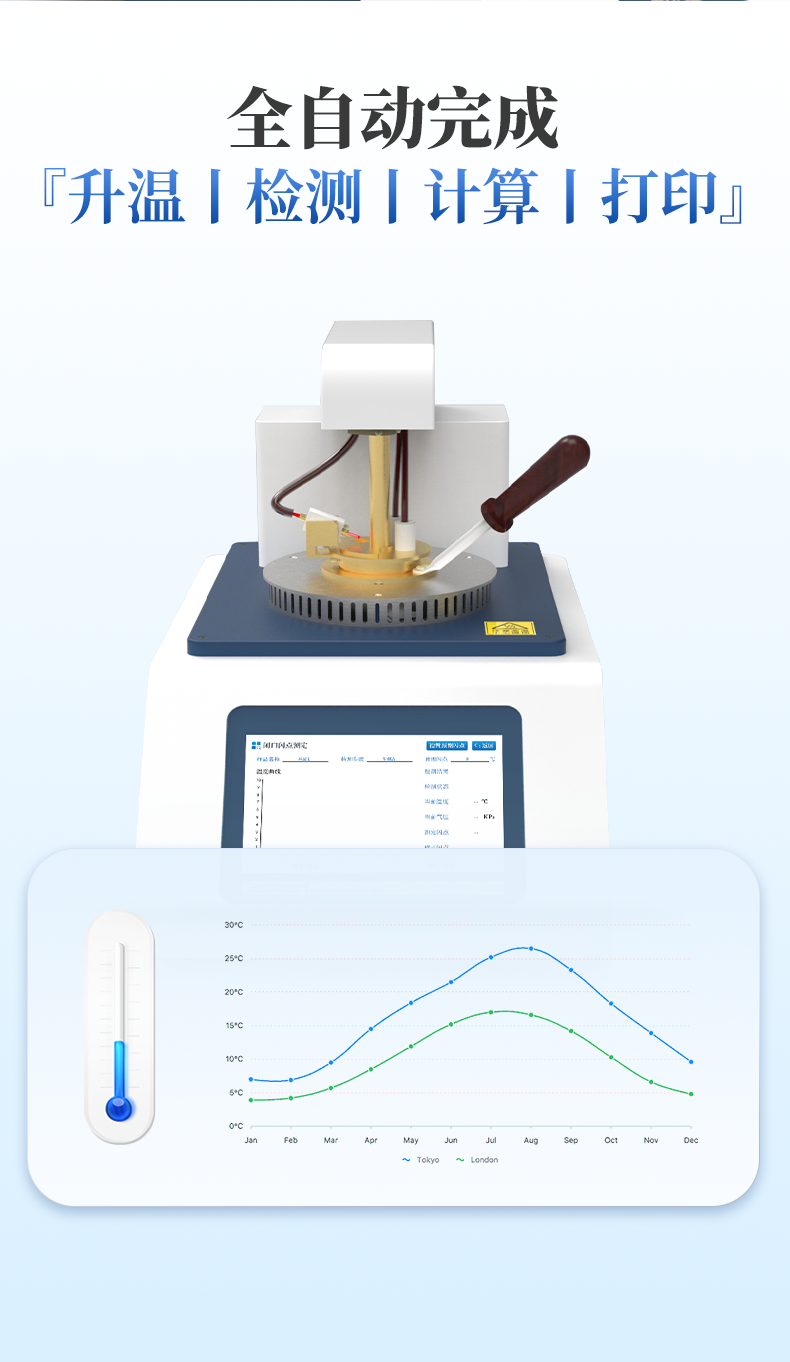 儀器按照GB/T 261-2021方法規(guī)定的升溫曲線加熱,溫度接近預(yù)期閃點(diǎn)值時(shí)自動(dòng)點(diǎn)火,當(dāng)出現(xiàn)閃點(diǎn)時(shí)儀器自動(dòng)鎖定結(jié)果,并顯示和打印,同時(shí)啟動(dòng)風(fēng)機(jī)自動(dòng)對加熱器進(jìn)行冷卻。