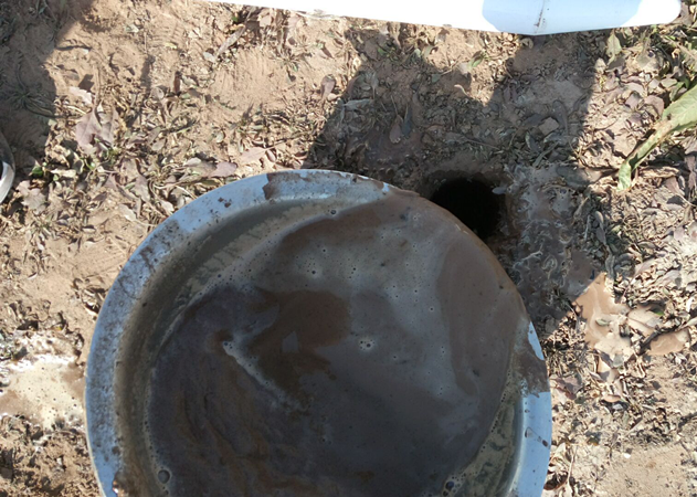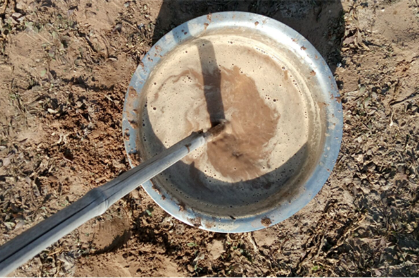 b. 將取土鉆從孔洞中取出,放到盆子里,用工具把鉆出的土收集到盆子里以用來和泥漿。(注意:初次鉆土因為雜質過多,不做收集)